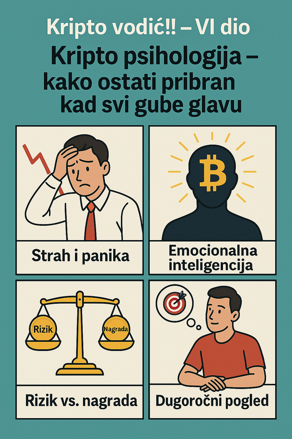Infografika Kripto vodič: Kripto psihologija prikazuje strah, emocionalnu inteligenciju uz Bitcoin simbol, rizik i nagradu na vagi, te dugoročnu strategiju s ciljem.