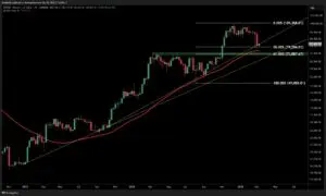 Grafikon prikazuje kretanje cijene Bitcoina (BTC/USD) od kraja 2023. do početka 2025. s tamnom podlogom i svijećnjacima, Fibonacci razinama, crvenom linijom 50-tjednog pomičnog prosjeka te žutom dijagonalnom linijom trenda rasta.