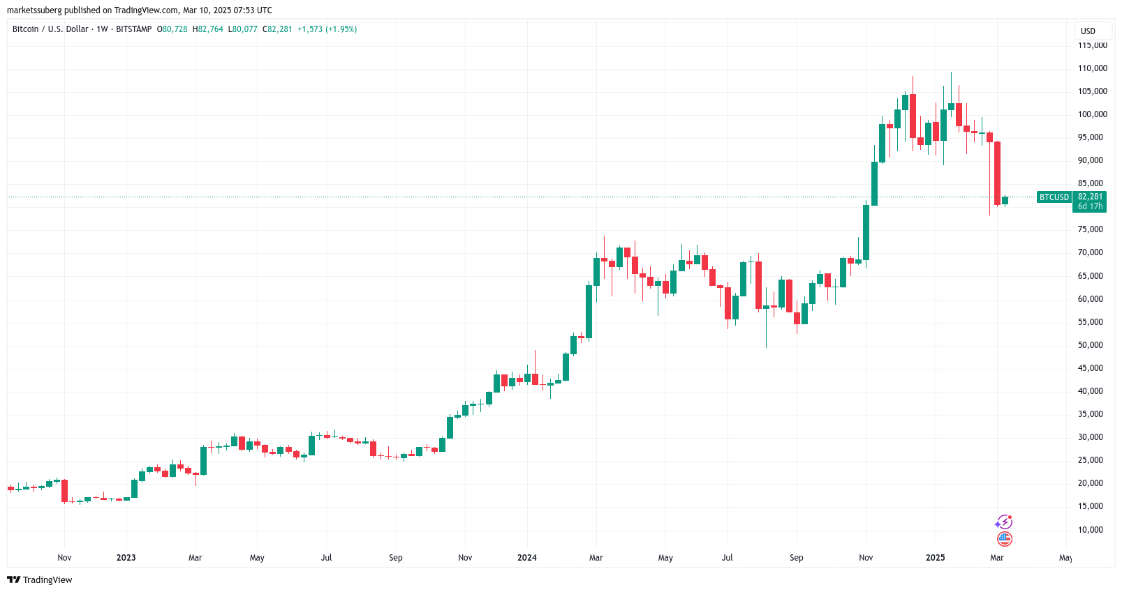 Tjedni grafikon svijeća prikazuje tečaj Bitcoin/USD od kraja 2022. do početka 2025. Vidljiv je rast do sredine 2024. kada cijena doseže 115,000 USD, nakon čega slijedi pad na oko 82,000 USD do ožujka 2025., što ukazuje na volatilnost i trendove na tržištu.