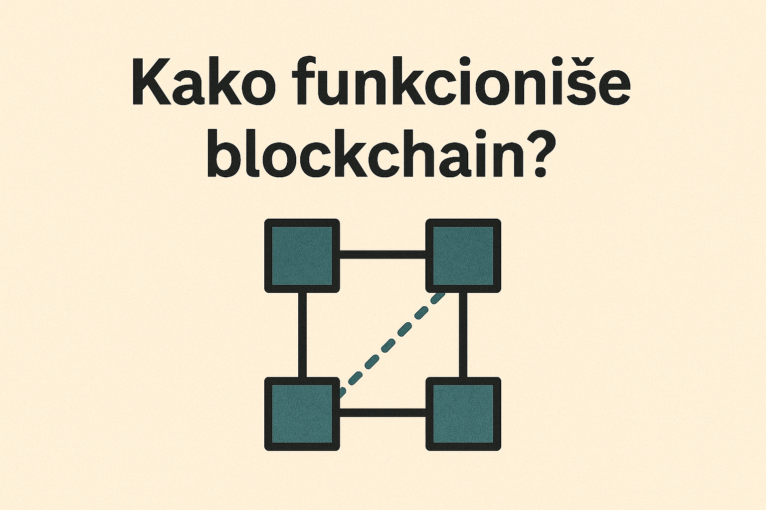 Minimalistički dijagram blockchaina s četiri povezana bloka na bež podlozi, povezani crnim linijama, s isprekidanom linijom koja prikazuje transakciju između dva bloka. Naslov glasi: Kako funkcioniše blockchain?