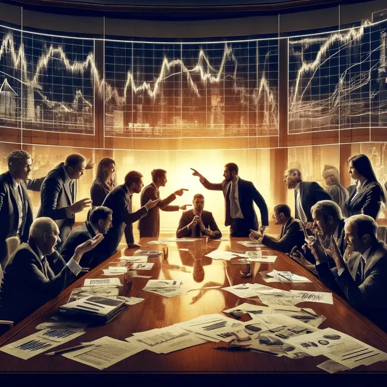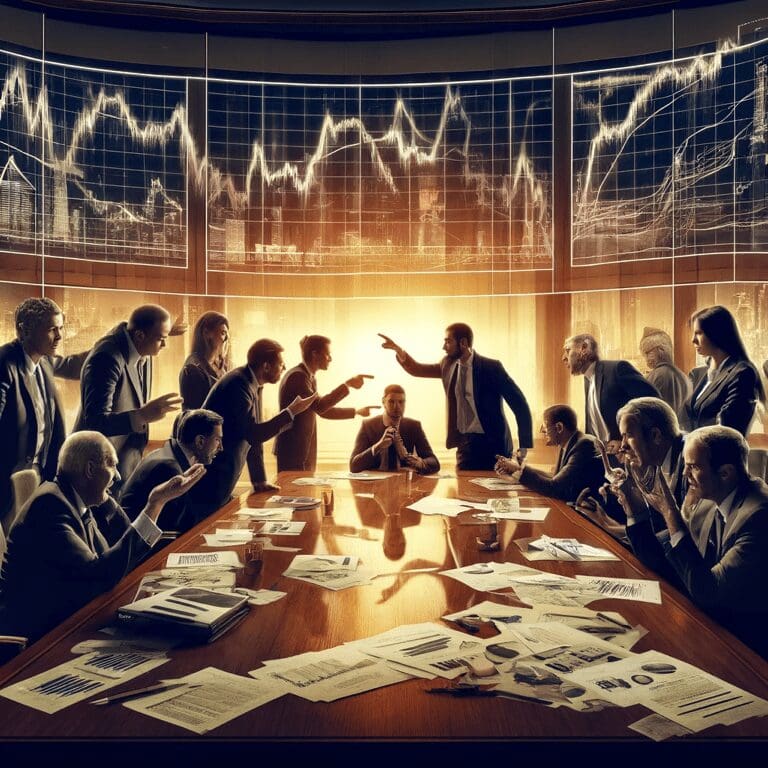 Intenzivna rasprava u korporativnoj sali; članovi uprave suočeni s financijskim gubicima.