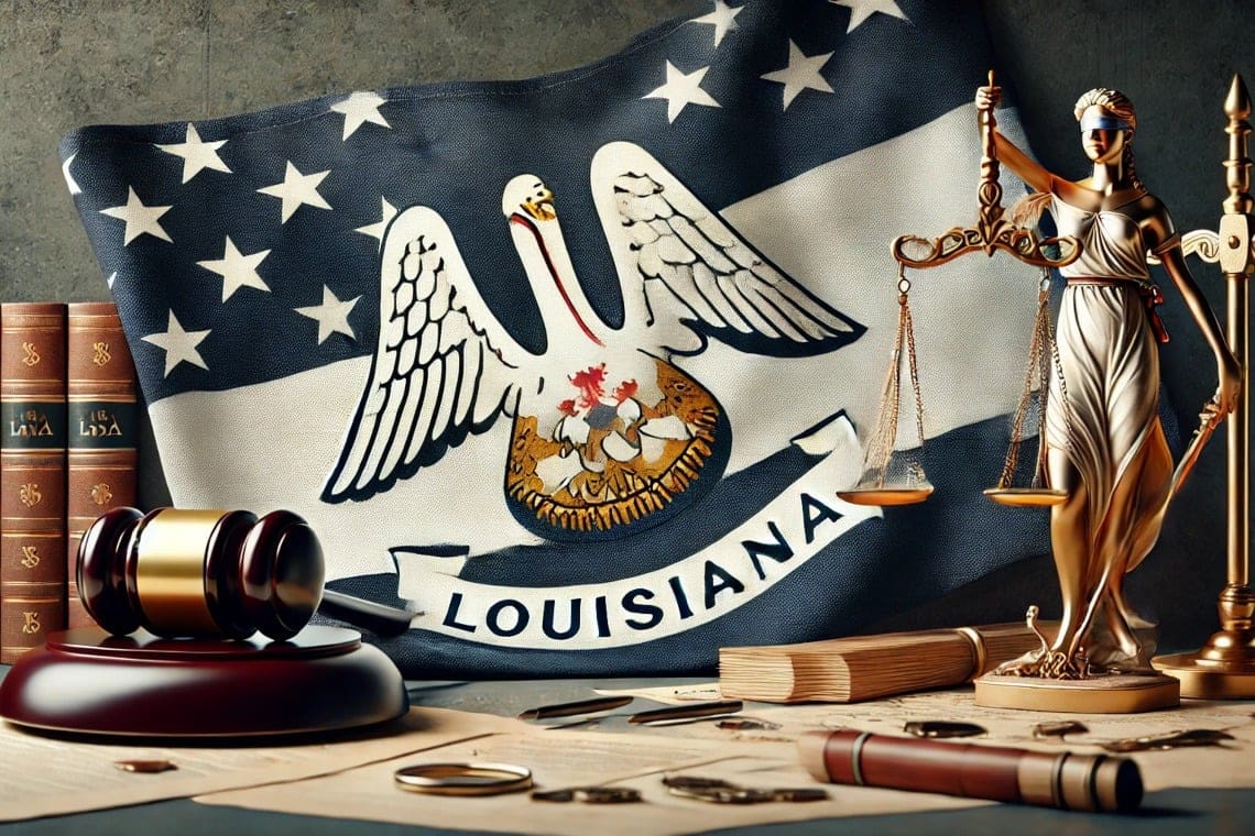 Zastava Louisiane sa simbolom pelikana u središtu, gavel i blok u prvom planu ukazuju na pravosudni sustav i pravnu praksu. Kip Pravde sa skalama i mačem predstavlja nepristranost, dok raspršeni novčići naglašavaju ekonomske aspekte prava.