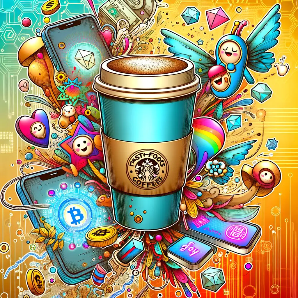 McDonald’s s Doodlesom web3 Team Liquid na Sui platformi, kriptoentuzijasti, crypto, nft,Vibrant digital umjetnost koja spaja kavu, tehnologiju i fantastična bića, reflektirajući suvremenu kulturu. Digital umjetnost prikazuje svijetlu turkiznu šalicu kave s natpisom Brza Kava u središtu. Oko nje lete šareni, karikaturalni likovi i digitalni uređaji, dok simboli kriptovaluta i apstraktni oblici stvaraju energičnu atmosferu koja spaja kavu i tehnologiju.