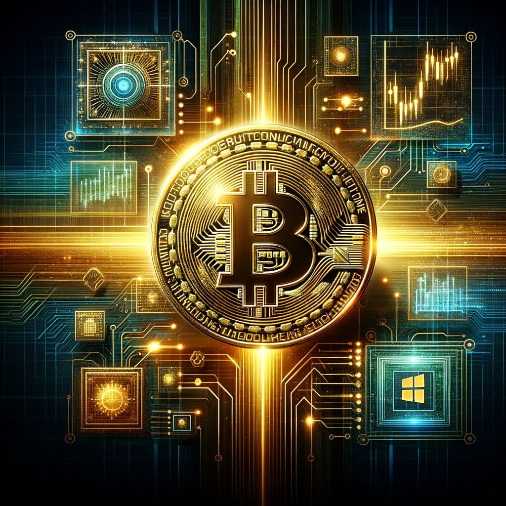 Zlatni Bitcoin simbol s tri dimenzije, smješten u središtu okrugle kovanice, okružen je tehnološkim motivima i financijskim grafikama. Linije i krugovi emitiraju svjetlost, simbolizirajući povezanost kriptovaluta i inovacije u digitalnom svijetu.