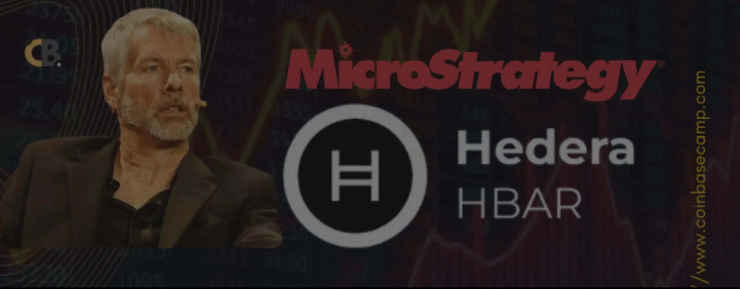 Slika prikazuje dizajn povezan s financijama i tehnologijom, s naglaskom na MicroStrategy i Hedera HBAR. U pozadini su grafike nalik financijskim grafikonima. Na lijevoj strani je profesionalac u odijelu, implicirajući autoritet u tehnologiji i financijama.