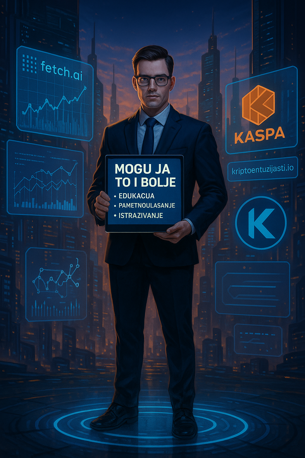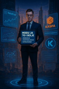 Muškarac u poslovnom odijelu stoji u futurističkom gradu sa svjetlima, držeći natpis MOGU JA TO I BOLJE iznad tema edukacije, ulaganja i istraživanja. Okružen digitalnim zaslonima s grafikonima fetch.ai i KASPA, simbolizirajući tehno-napredak i inovaciju.