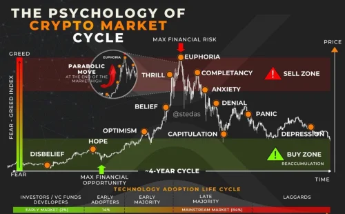 Infografika pod naslovom Psihologija Kripto Tržišnog Ciklusa: Emocije Investitora prikazuje emocionalno putovanje ulagača kroz različite faze tržišnog ciklusa, od nevjerice do depresije, uz naglašavanje strateških trenutaka kupnje. Mapa također povezuje emocionalne faze s ciklusom usvajanja tehnologije.