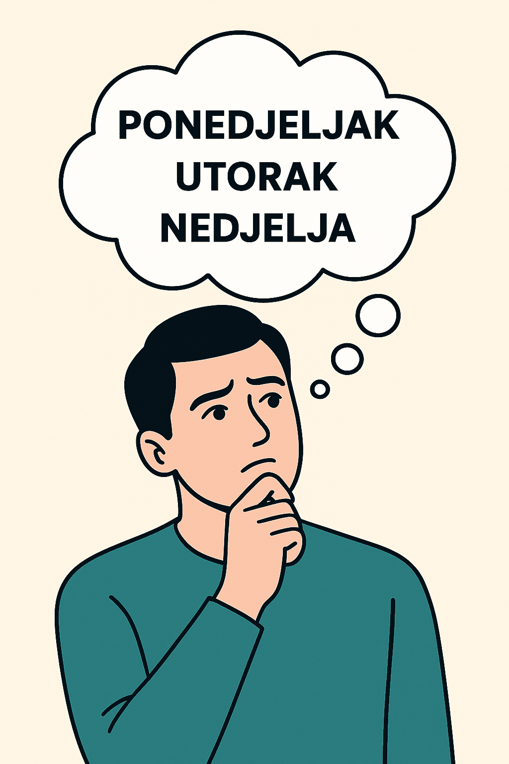 Crno-bijeli crtež osobe u razmišljanju, s rukom na bradi. Iznad je oblačić s natpisom PONEDJELJAK, UTORAK, NEDJELJA, što sugerira planiranje ili organiziranje vremena. Osoba nosi teget majicu, pozadina je svijetlo bež boje.