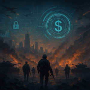 Vojnici prolaze kroz ratno razaranje grada s digitalnim simbolima novca i tehnologije iznad scene, prikazujući sukob na bojnom polju i u digitalnoj sferi.