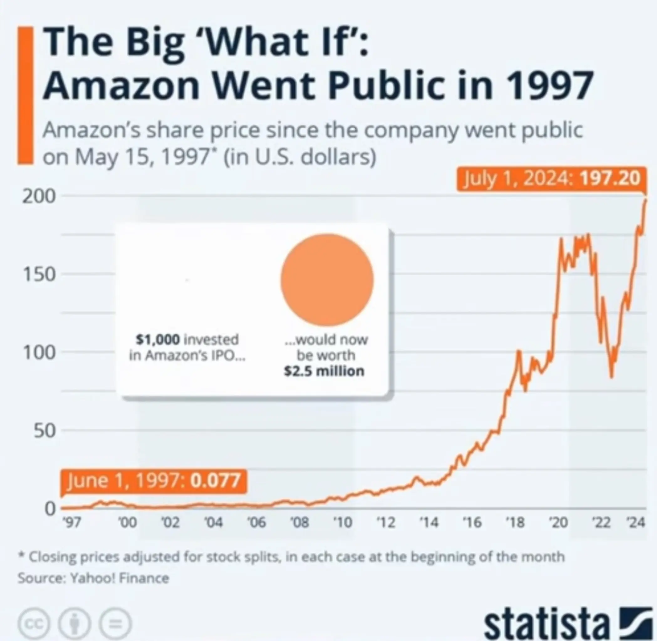 Grafikon prikazuje rast cijene dionica Amazona od IPO-a 1997. do 2024., s početnom vrijednošću 0,077 USD i krajnjom 197,20 USD. Ističe kako bi ulaganje od 1.000 USD na početku vrijedilo 2,5 milijuna USD 2024. godine, uz uočljive uspone i padove na tržištu.