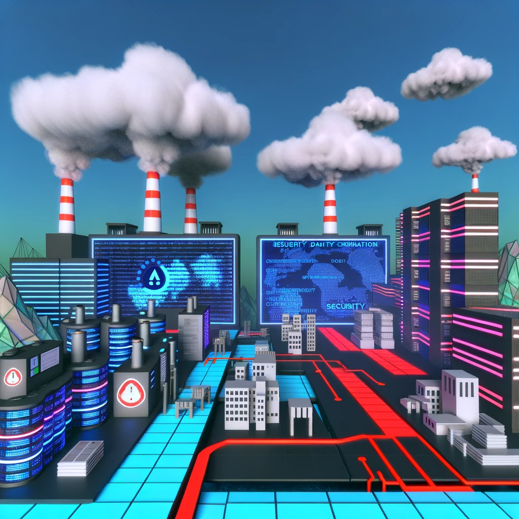 Futuristički grad s modernom arhitekturom, neonskim svjetlima i digitalnim ekranima ističe suživot tehnologije i industrije. U pozadini se nalaze dimnjaci koji ispuštaju dim, stvarajući kontrast između visoke tehnologije i tradicionalne industrije.
