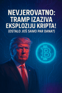 Slika prikazuje velik naslov na hrvatskom jeziku o Trumpu i kripto eksploziji, uz njegov portret u odijelu na digitalnoj pozadini s Bitcoin simbolom, naglašavajući temu tehnologije, vijesti i kriptovaluta.
