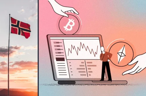 Slika prikazuje norvešku zastavu na jarbolu pri zalasku ili izlasku sunca lijevo te digitalnu ilustraciju s prijenosnim računalom i grafikonom kriptovaluta desno, s rukama koje drže simbole Bitcoina i Ethereuma, te stiliziranom ljudskom figurom koja promatra ekran.