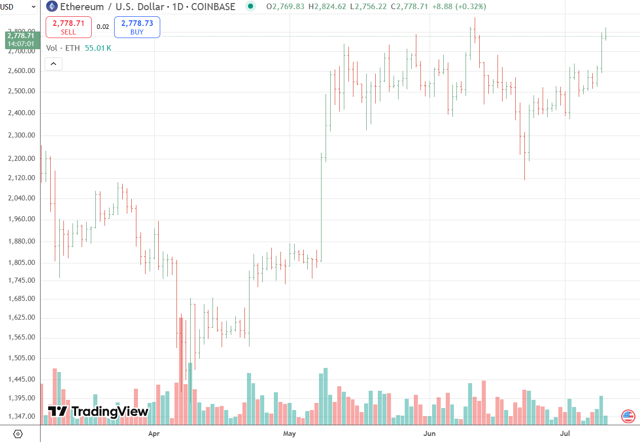 Dnevni grafikon cijene Ethereuma (ETH) prema američkom dolaru na Coinbase burzi prikazuje snažan rast u svibnju, zatim konsolidaciju i kretanje prema višim razinama, uz istaknute volumene i podatke o trgovanju.