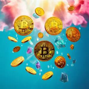 Zlatne Bitcoin kovanice i šareni dragulji u nebu, simbol bogatstva i inovacija.