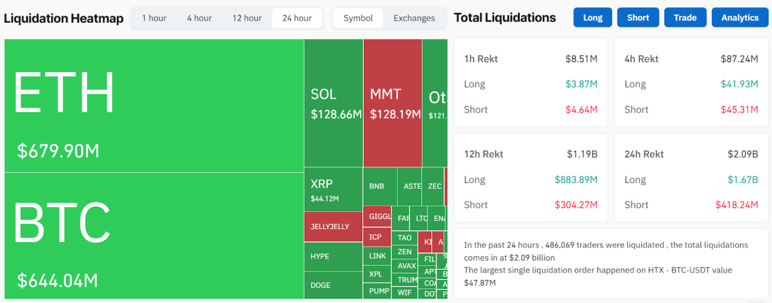 Heatmap kripto likvidacija prikazuje masivne gubitke za ETH ($679.90M) i BTC ($644.04M). Ukupno je likvidirano 486.069 trgovaca s $2.09 milijardi u 24 sata, uz vidljive SOL i MMT.