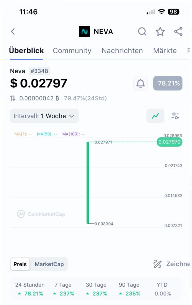 Povečanjem Market Cap samog projekta NEVA , povečanom moći trgovanja postavili smo marketcap na 3.2M sami projekat ima povečanu volativnost i mogućnost za velikim skokom Market capa.