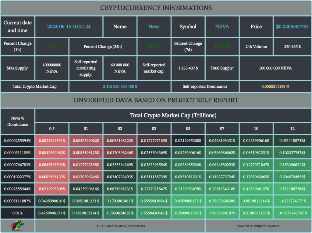Ovdje vidimo podatke i scenarije cijena projekta NEVA sa cijenom od 0.0205$. Temeljem ovih podatka koje posjedujemo i sami projekt napravit ćemo tehničku analizu.