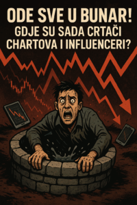Ilustracija prikazuje preplašenog muškarca kako izlazi iz bunara, okružen crvenim padajućim burzovnim grafikonima na mobitelu i tabletu, uz natpis Ode sve u bunar! Gdje su sada crtači chartova i influenceri?.