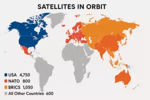 Svjetska karta prikazuje broj satelita u orbiti po državama, s naglaskom na SAD, NATO, BRICS i druge zemlje, uz boje koje ilustriraju veliku dominaciju SAD-a i tehnološke razlike među regijama.