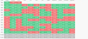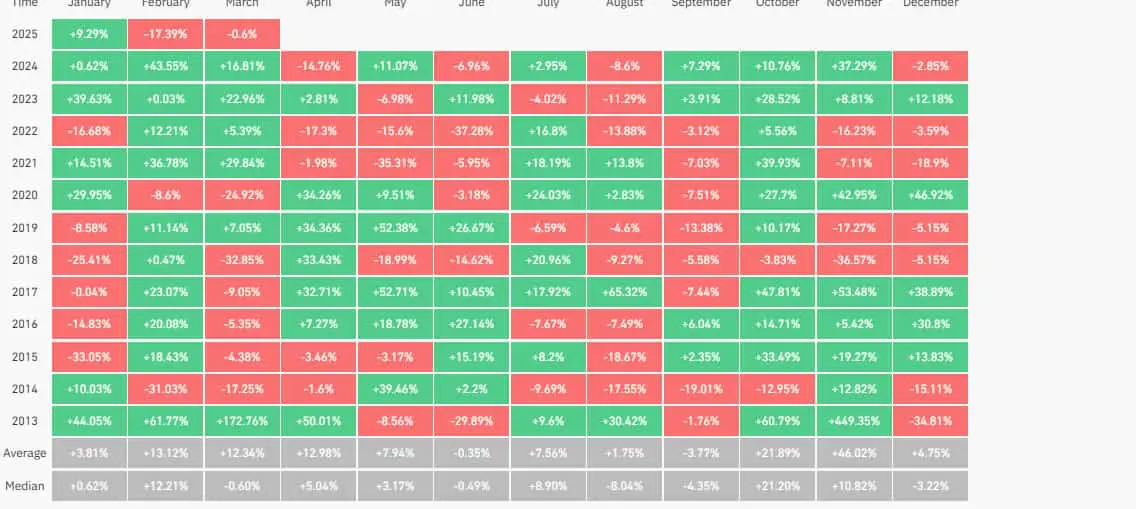 Tablica prikazuje mjesečne performanse od 2013. do 2025., uključujući pozitivne i negativne trendove izražene u postocima. Brojevi su bojama označeni: zelena za rast i crvena za pad, s prosjecima i medijanama na dnu za pregled dugoročnih trendova.