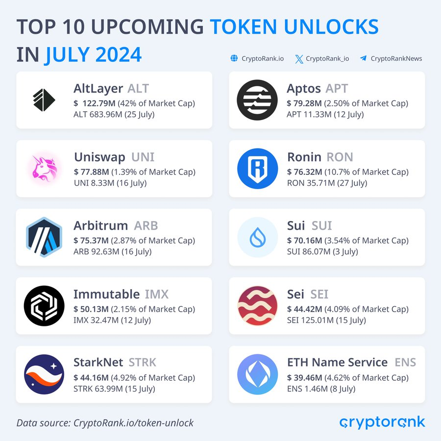 Ostala značajna srpanjska otključavanja uključuju Uniswap (UNI), Ronin (RON), SUI , ImmutableX ( IMX ), SEI, Starknet (STRK) i Ethereum Name Service ( ENS ). Uniswap planira izdati 8,33 milijuna UNI tokena u vrijednosti od 77,88 milijuna dolara 16. srpnja. Ronin će izdati 35,71 milijuna RON tokena u vrijednosti od 76,32 milijuna dolara počevši od 27. srpnja.