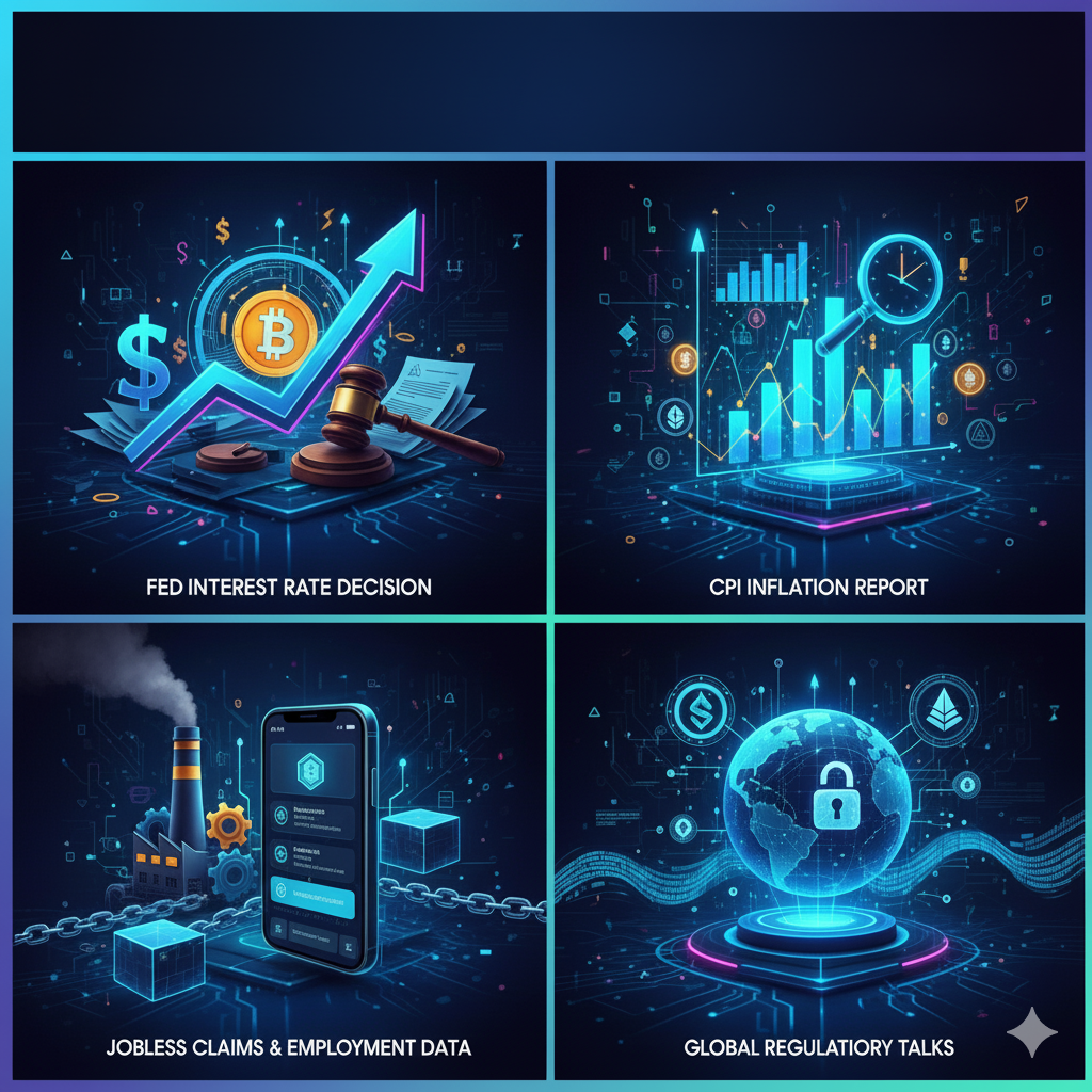 Četiri panela prikazuju futurističke digitalne koncepte ekonomskih pokazatelja: odluke FED-a, izvješća o inflaciji, podatke o zaposlenosti i globalne regulatorne razgovore, s naglaskom na financije i kriptovalute.