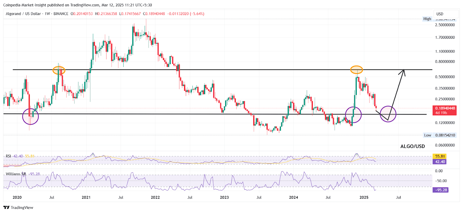 Financijski grafikon prikazuje tjedne cijene Algorand (ALGO) u odnosu na USD od 2019. do 2025. godine. Prikazuje razine podrške i otpora, RSI i Williams %R indikatore te predviđa mogući rast cijene prema 0.80000000 USD.