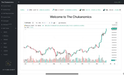 Screenshot trgovinske platforme The Chukanomics prikazuje pregled cjenovnih kretanja kriptovaluta kao što su ETH i BTC te njihovu izvedbu na MEXC burzi. Središnje mjesto zauzima svijećnjak s pozitivnim trendom, uz korisničko sučelje koje nudi navigaciju i analizu tržišta.