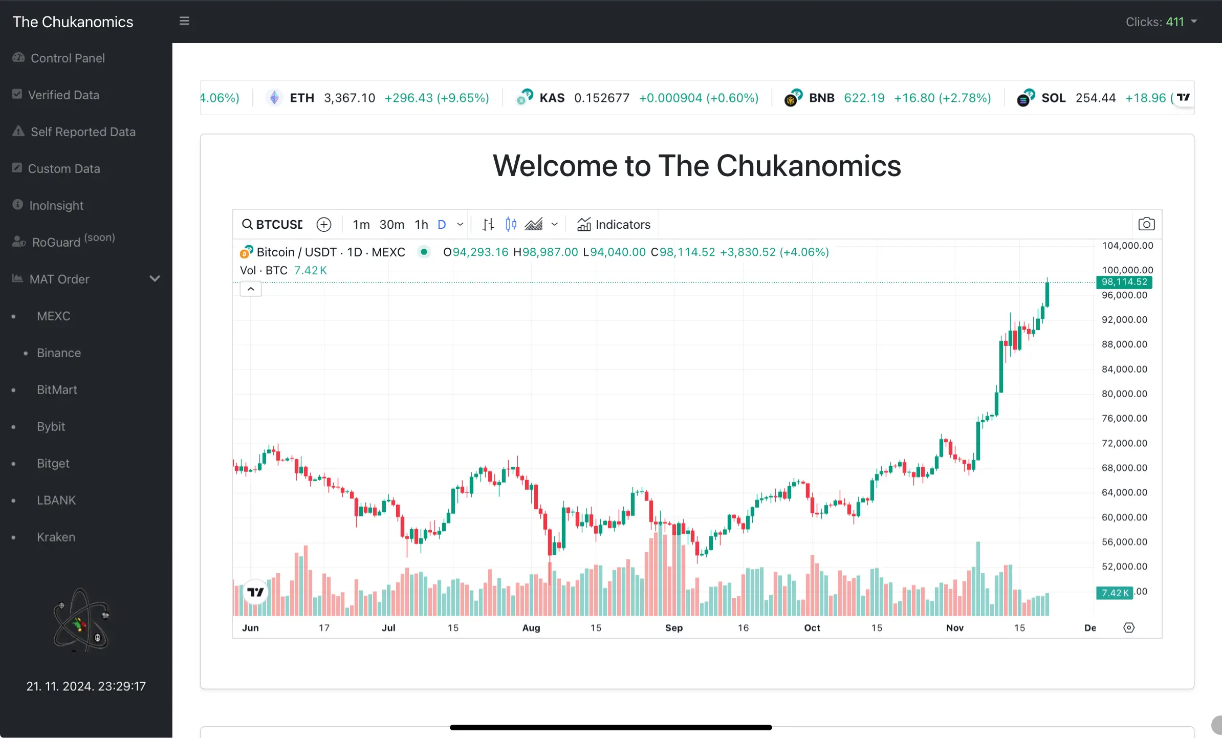 Platforma Chukanomics nudi analizu tržišta kriptovaluta s fokusom na Bitcoin (BTC) protiv Tethera (USDT) na MEXC burzi. Prikazana su trenutna i povijesna kretanja cijena, s candlestick grafikonima, volumenom trgovanja i ažuriranim cijenama drugih kriptovaluta.