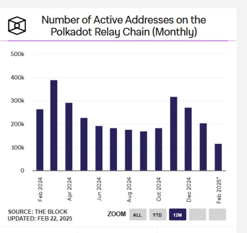 Bar grafikon prikazuje mjesečni broj aktivnih adresa na Polkadot Relay Chainu od veljače 2024. do veljače 2025. Najviši broj registriran je u ožujku i listopadu 2024. s 450,000. Kroz godinu, aktivne adrese variraju od 150,000 do 450,000.