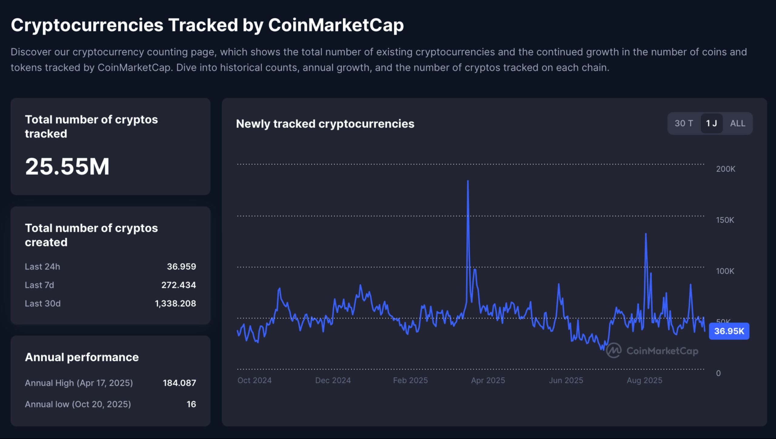 Tamna CoinMarketCap nadzorna ploča pruža pregled kriptovaluta. Prikazuje ukupan broj praćenih kriptovaluta, statistike stvaranja te grafikon Novo praćene kriptovalute s trendovima do kolovoza 2025.