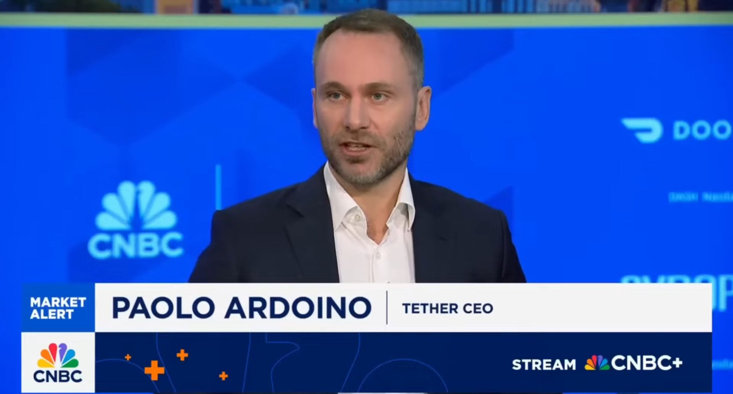 Paolo Ardoino, CEO Tethera, gostuje u studiju CNBC-a tijekom televizijskog intervjua o kriptovalutama i financijskim tržištima, s izrazom lica u sredini razgovora i prepoznatljivom CNBC grafikom u pozadini.