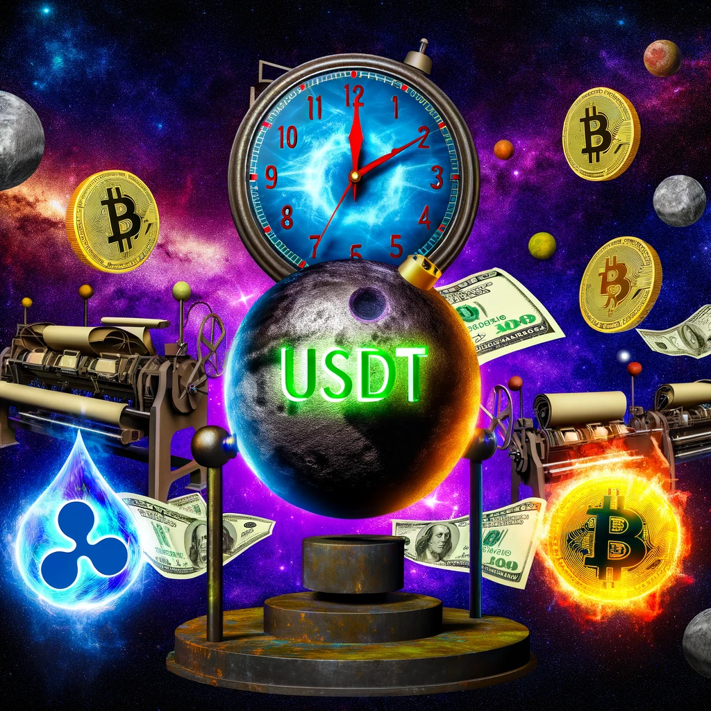 Središnji motiv slike je velika sfera s oznakom USDT u živoj zelenoj boji, okružena simbolima kriptovaluta poput Bitcoin i Ripple. U pozadini se prostire neumoljiv svemir, dok vintage sat i tiskare novca naglašavaju dinamičnu prirodu globalnih financija.