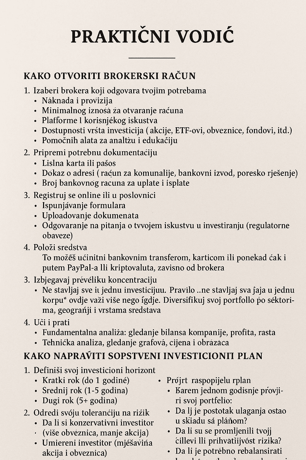 Praktični vodič na hrvatskom jeziku nudi korake za otvaranje brokerskog računa i izradu osobnog investicijskog plana, uključujući izbor brokera, potrebne dokumente, registraciju, uplatu sredstava, diverzifikaciju ulaganja i kontinuirano praćenje portfelja.