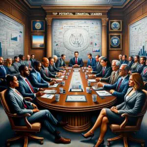 Slika prikazuje elegantnu konferencijsku prostoriju s velikim drvenim stolom oko kojeg sjedi raznolika grupa poslovnih vođa u formalnim odijelima. Sudionici aktivno raspravljaju o važnim pitanjima, dok su na zidovima prikazani grafikoni i dijagrami, naglašavajući ozbiljnost razgovora o mogućem novom predsjedniku SEC-a.