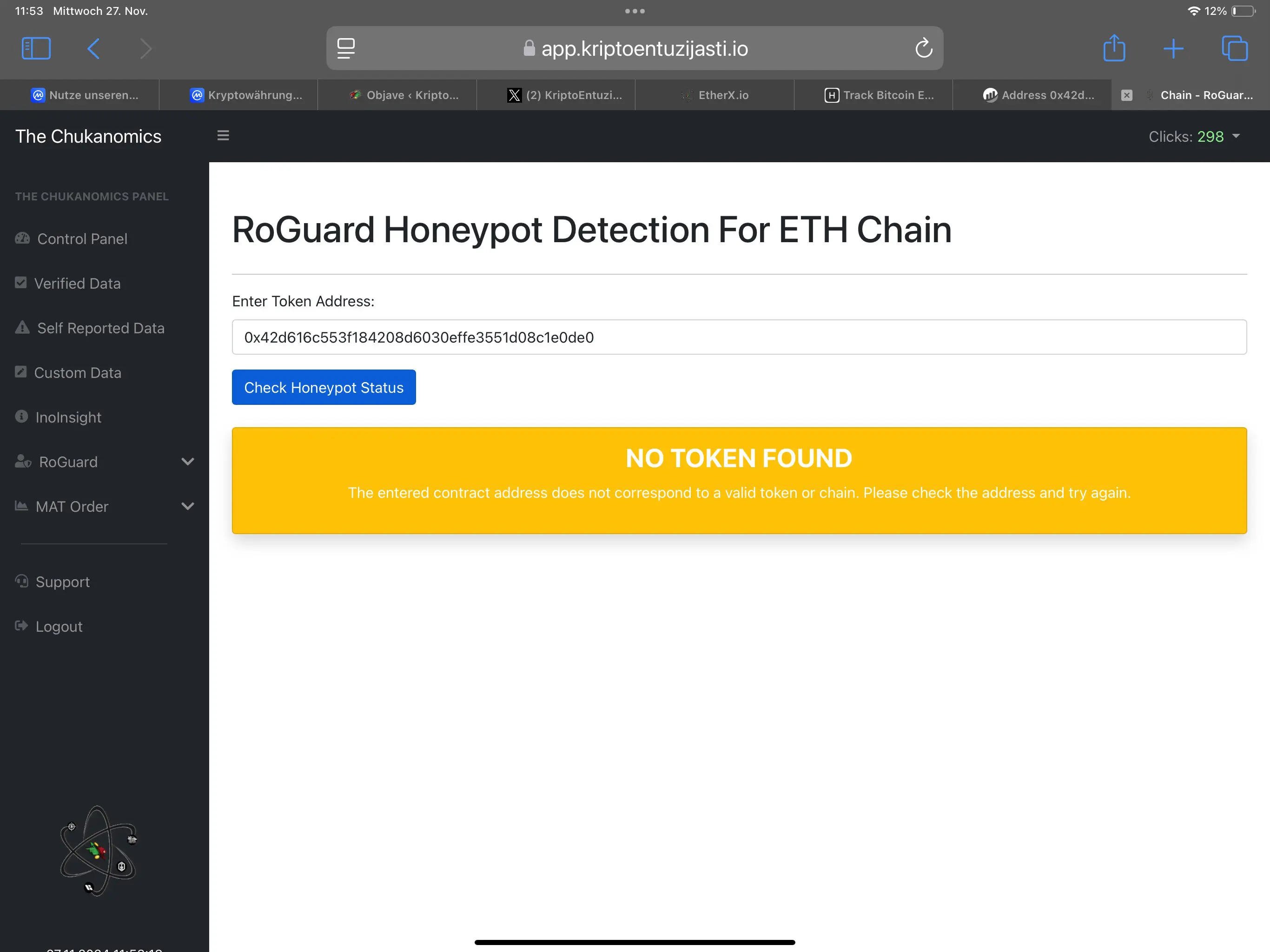 Snimka zaslona prikazuje web aplikaciju RoGuard Honeypot Detection za Ethereum tokene, s poljem za unos adrese tokena, gumbom za provjeru statusa i porukom NO TOKEN FOUND. Aplikacija pomaže u otkrivanju potencijalnih prevara u kriptovalutama.