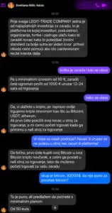 Svetlana Milic Adžić vodi razgovor o investicijskim mogućnostima s LEGIT-TRADE COMPANY, naglašavajući profitabilnost ulaganja u kriptovalute poput Bitcoina. Objašnjava proces ulaganja, potencijalne zarade i mogućnost početnog ulaganja od 50 eura.