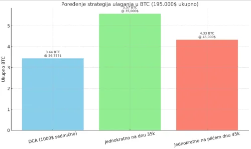 Na papiru, ideja da pričekaš dok BTC ne dotakne apsolutno dno i tek tada uložiš zvuči idealno. Ako bi, recimo, 2027. cijena bila 25.000$ ili 35.000$, a ti tada uložio 195.000$ odjednom, kupio bi između 7,8 i 5,6 BTC-a – gotovo dvostruko više nego što bi skupio DCA tehnikom. Na prvi pogled, razlika je ogromna.