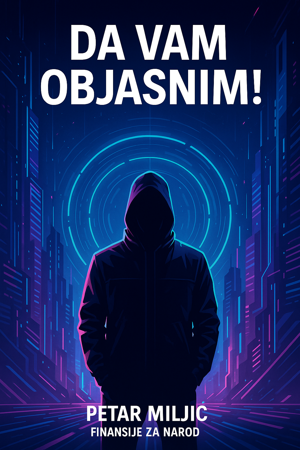Misteriozna osoba u hoodici stoji ispred futurističkog neon grada, naglašena plavim svjetlosnim krugovima, s naslovom DA VAM OBJASNIM! i imenom Petar Miljić, financije za narod.