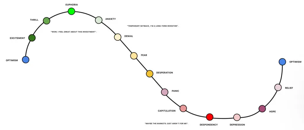 Psihologija ciklusa burze. Najveća greška koju investitori prave je reagiranje na emocije. Kada tržište raste, pohlepa ih tjera da kupuju na vrhuncu. Kada tržište pada, strah ih tjera da prodaju pri dnu. Tako se gubi novac – ne zbog lošeg projekta ili pogrešne analize, već zbog emocionalne reakcije.