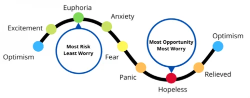 Dijagram prikazuje emocionalni ciklus ulagača u vezi s tržišnim fluktuacijama, od optimizma i uzbuđenja do euforije, tjeskobe, panike i očaja, a zatim povratak kroz olakšanje natrag do optimizma. Ciklus naglašava subjektivne rizike i prilike.
