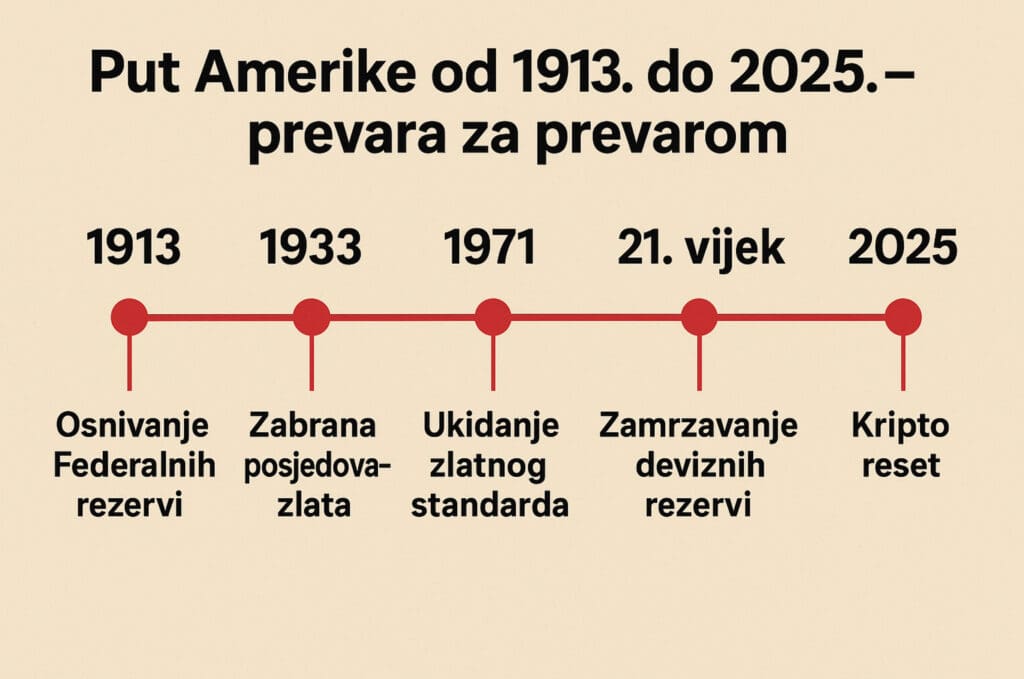 Put Amerike od 1913. do 2025. Amerika je nizala prevaru za prevarom, a svijet je uvijek iznova plaćao cijenu. Danas, pred nama je nova faza – kripto reset od 35 biliona dolara. Hoće li svijet ponovo nasjesti ili će se konačno obraniti stvaranjem paralelnog financijskog sistema – pitanje je koje će odrediti budućnost čovječanstva.