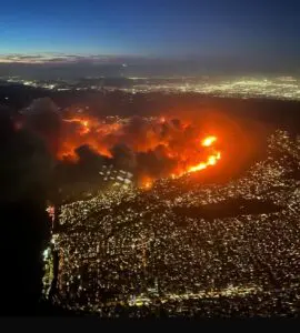 Ova zračna slika prikazuje snažan požar u gradu pri zalasku sunca, s plamenovima koji osvjetljavaju noć. Oko vatre se proteže gradska svjetla, naglašavajući kontrast između ljudskog naselja i divlje prirode. Tamni dim se uzdiže u sumraku, stvarajući dramatičnu atmosferu.