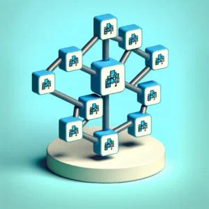 Mrežni model prikazuje trodimenzionalnu strukturu sastavljenu od dvanaest plavih kockica povezanim srebrnim šipkama na svijetlosmeđoj podlozi. Središnja kockica, uzdignuta i povezana, simbolizira važnost povezanosti i suvremenost digitalnih mreža uz smirujću teal pozadinu.