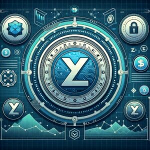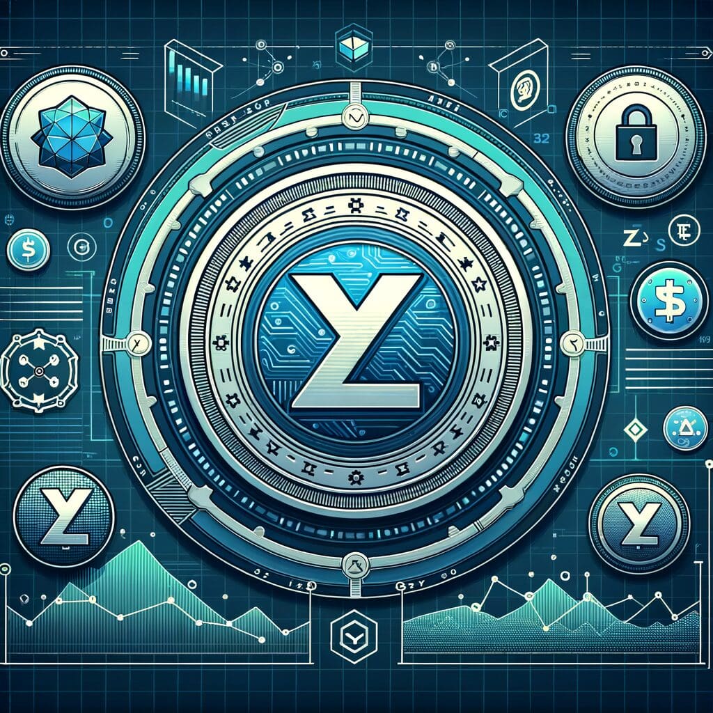 Slika prikazuje sofisticirani simbol digitalne valute s naglaskom na blockchain tehnologiju. Središnji emblem u obliku stiliziranog Y okružen je ikonama koje simboliziraju sigurnost i financijske analize, dok tamna mrežasta pozadina dodaje dubinu i povezanost s modernim financijama.