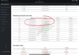 Aplikacija Chukanomics prikazuje predikcijske financijske podatke za razdoblje 2024.-2034., sa stolom koji nudi minimalne i maksimalne cijene uz relevantne datume. Uključeni su analitički indikatori, a naglašeni podaci za 2025. i 2026. godine su označeni crvenim krugom.