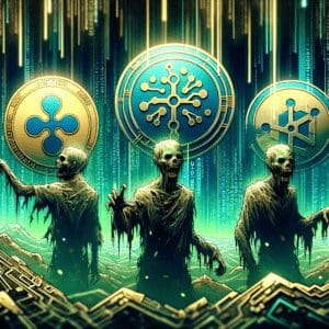 U središtu slike su tri kosturske figure u rastrganim plaštevima, okružene zeleno-plavom atmosferom. U pozadini se nalaze svjetleći, kovanici nalik simbolima sa zlatno-tealnim tonovima. Krajolik spaja organski i digitalni svijet, stvarajući osjećaj spajanja tehnologije i prirode.