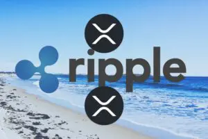Mirna plaža s plavim nebom i valovima, prekrivena morskom travom i oblucima. U središtu slike nalazi se Ripple logo s plavim simbolom, dok je iznad i ispod prikazan crni XRP logo, naglašavajući povezanost s kriptovalutom.