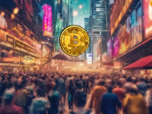 Zamislite užurbani futuristički grad s velikim digitalnim Bitcoin simbolom u zlatnoj boji koji lebdi iznad užurbanih ulica. Oko njega su neonski oglasi i neboderi, simbolizirajući moć i utjecaj digitalne ekonomije u urbanom pejzažu.